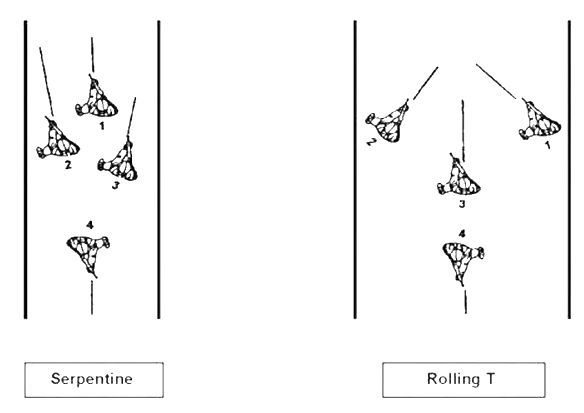 -Danach gehen 2 und 4 Aufrecht an die gegenüberliegende Wand und die Rolling-T oder Serpentine Formation wird wieder errichtet